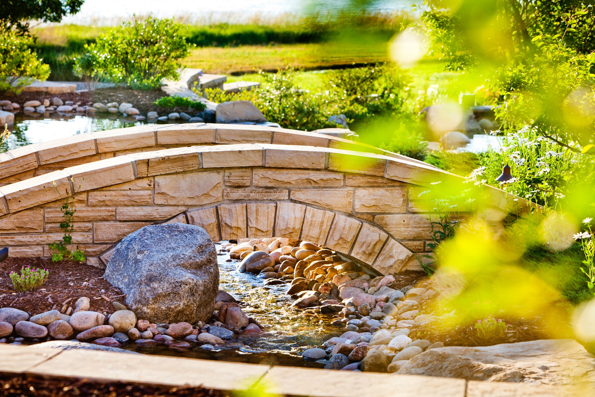 Custom designed stone bridges connect the flagstone walkways over the waterfalls and streams that pour over the formal masonry walls into a pond. A sunken wood burning firepit within the flagstone patio creates an ambient atmosphere next to the pond, while naturalistic and native planting soften the areas in between the hardscapes.
