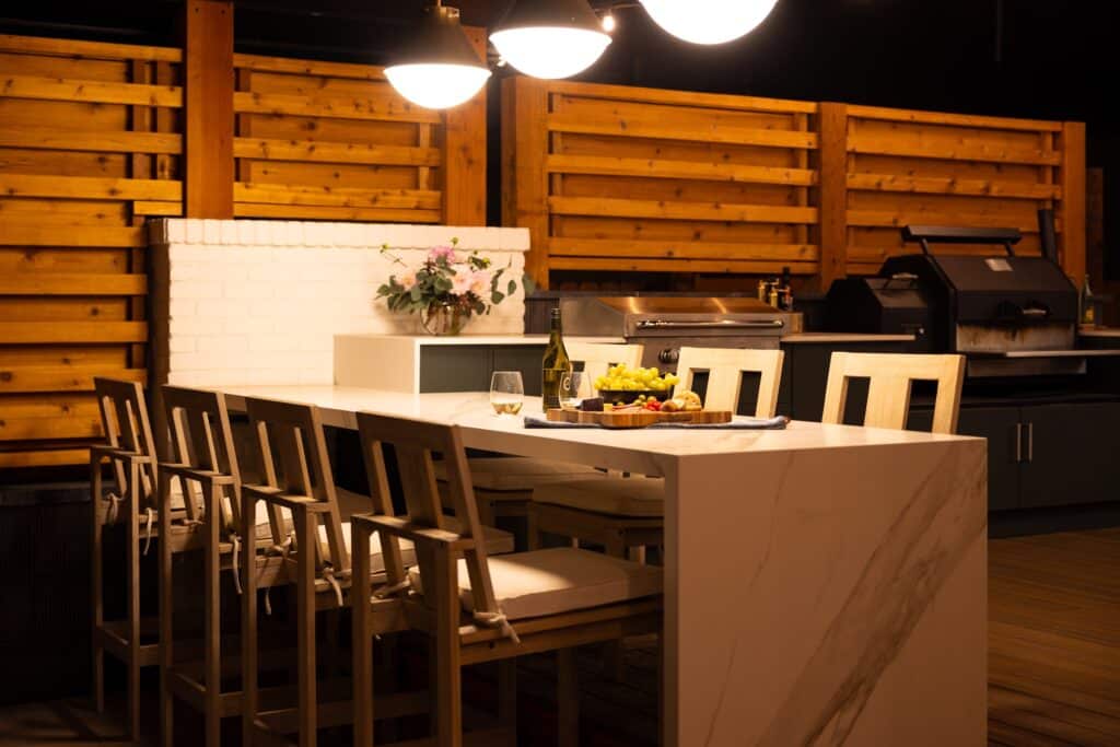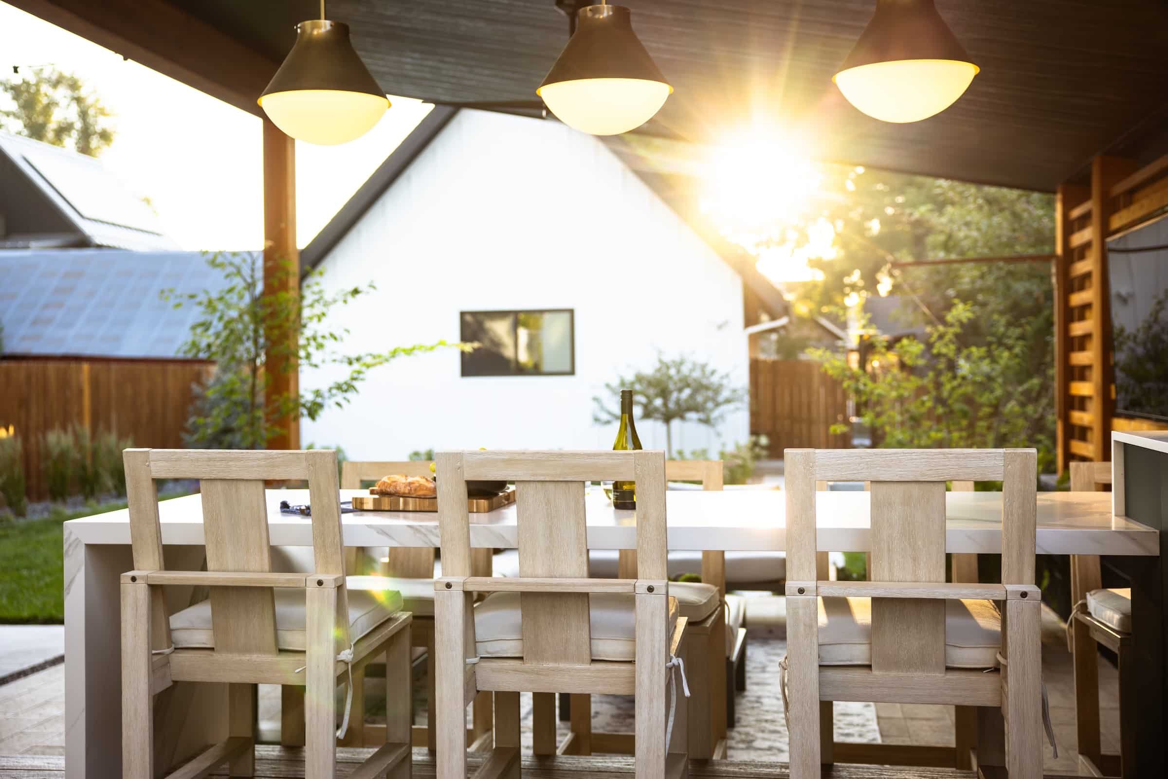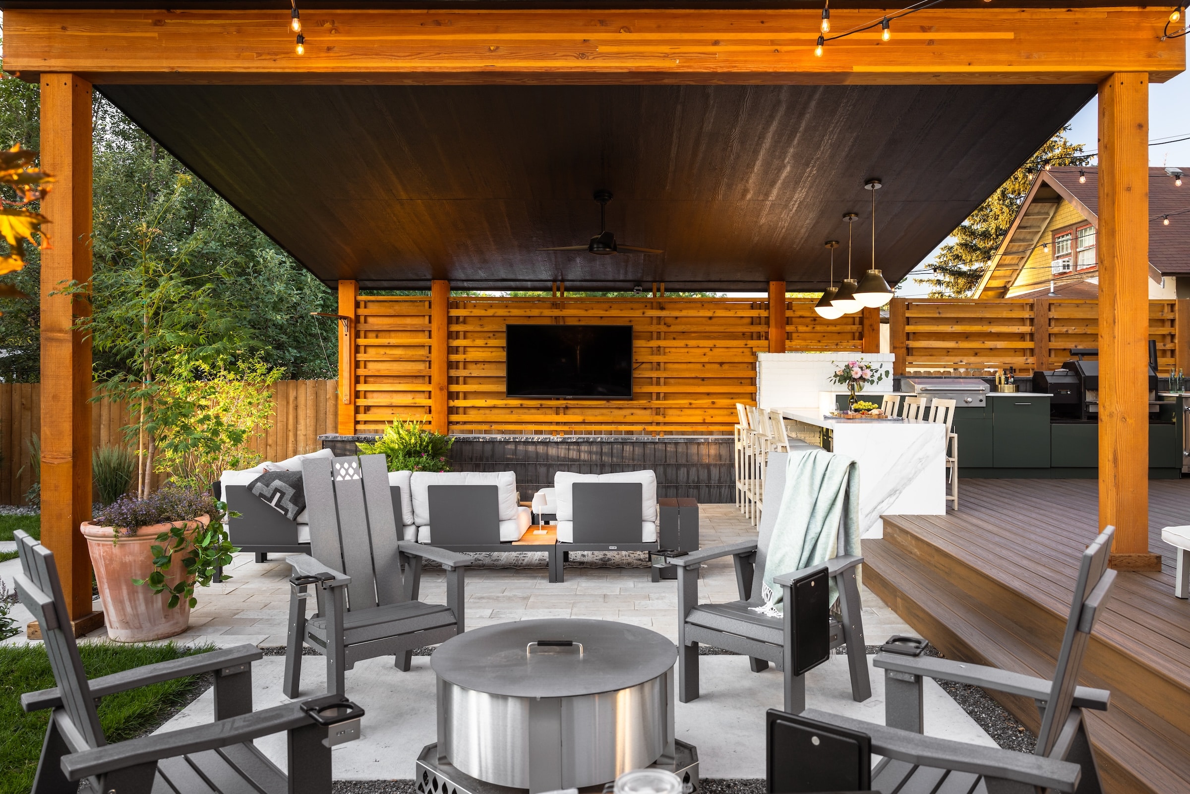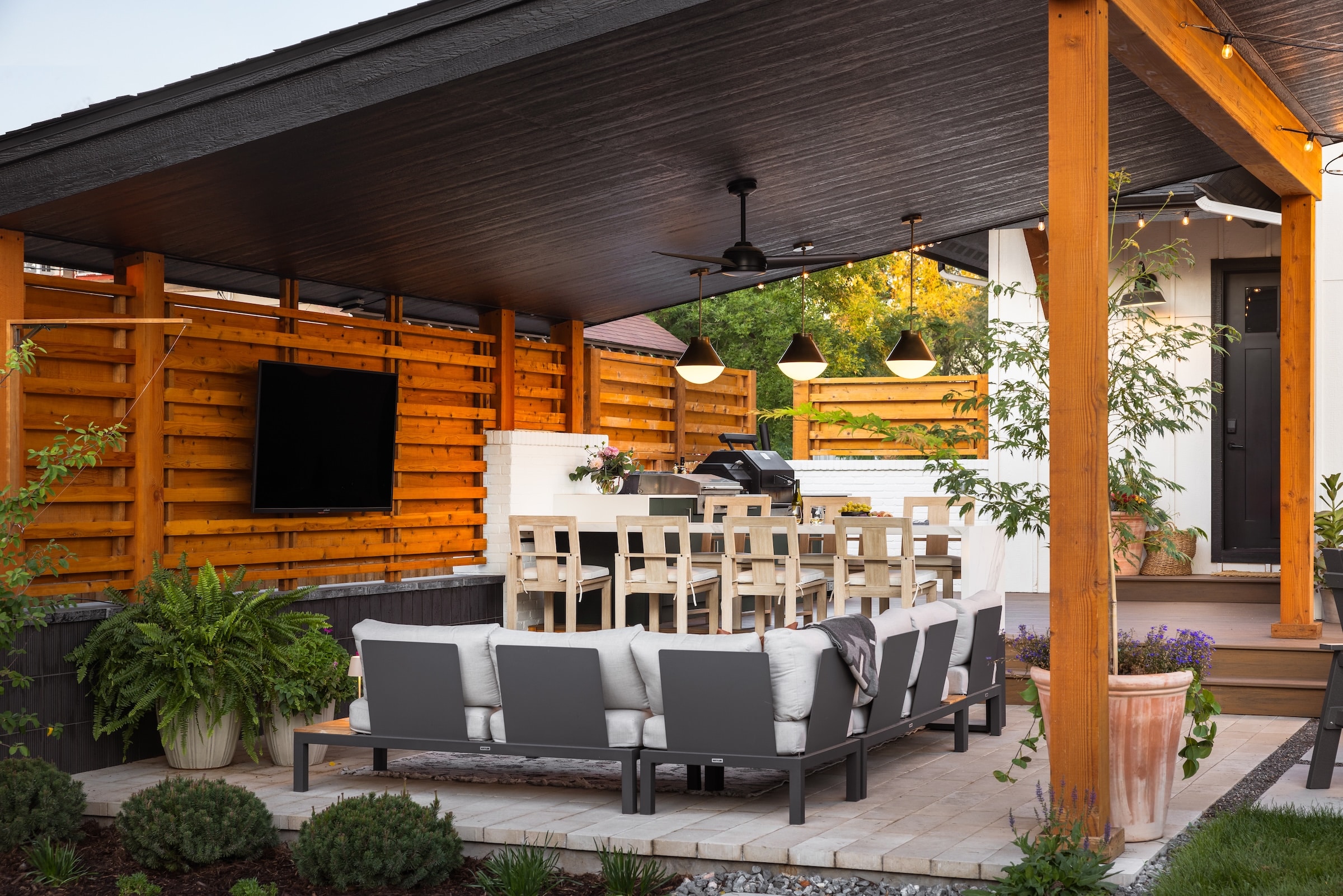 With a goal to enjoy the backyard and provide entertainment and hospitality, this backyard landscape needed intentional features. A custom shade structure, landscape lights, an outdoor kitchen and other features all served to bring the goal to fruition.